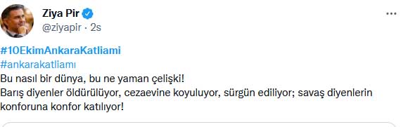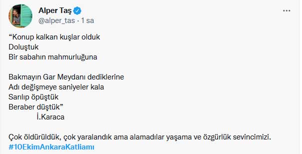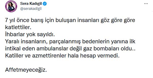 TİP Milletvekili Sera Kadigil anma mesajında "Yaralı insanların, parçalanmış bedenlerin yanına ilk intikal eden ambulanslar değil gaz bombaları oldu" ifadelerini kullandı.