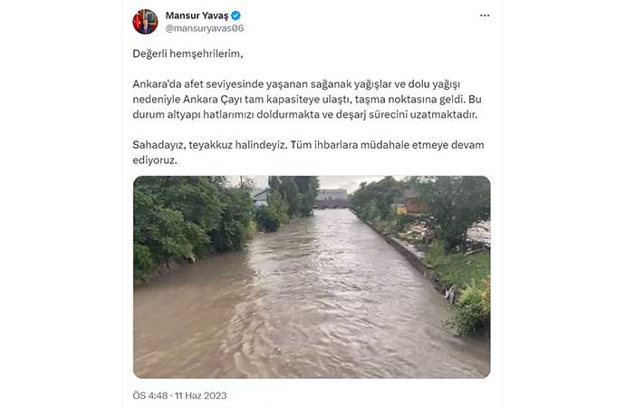 Sosyal medya hesabından paylaşım yapan Mansur Yavaş, “Ankara'da afet seviyesinde yaşanan sağanak yağışlar ve dolu yağışı nedeniyle Ankara Çayı tam kapasiteye ulaştı, taşma noktasına geldi. Bu durum altyapı hatlarımızı doldurmakta ve deşarj sürecini uzatmaktadır. Sahadayız, teyakkuz halindeyiz. Tüm ihbarlara müdahale etmeye devam ediyoruz” ifadelerini kullandı.