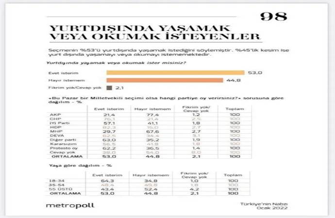 Metropoll Araştırma'nın yaptığı ankete göre seçmenin yüzde 53'ü yurtdışında yaşamak veya okumak istiyor.