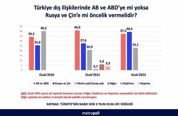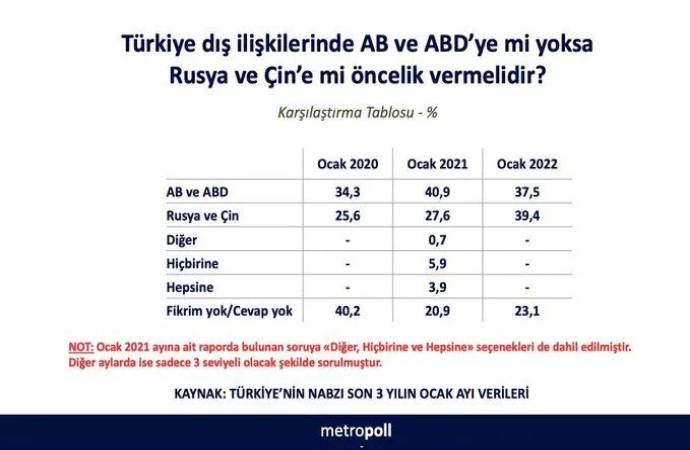 Ankette, 'Türkiye'nin dış ilişkilerinde AB ve ABD'ye mi yoksa Rusya ve Çin'e mi öncelik vermesi gerektiği' sorusu da yöneltilmiş ve yüzde 39,4 oranıyla Rusya-Çin tercihi ilk sırada yer almıştı.
