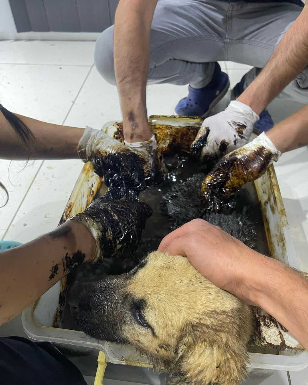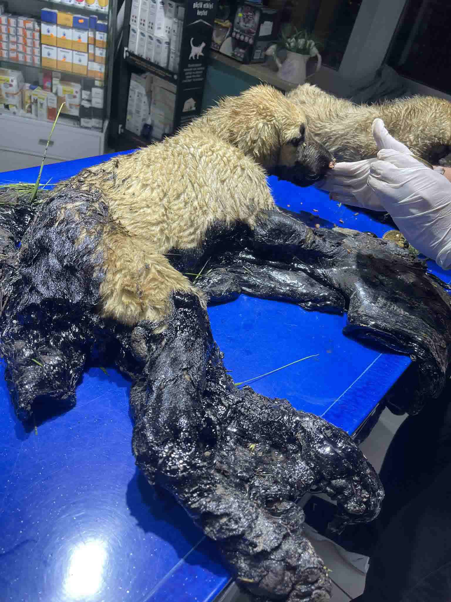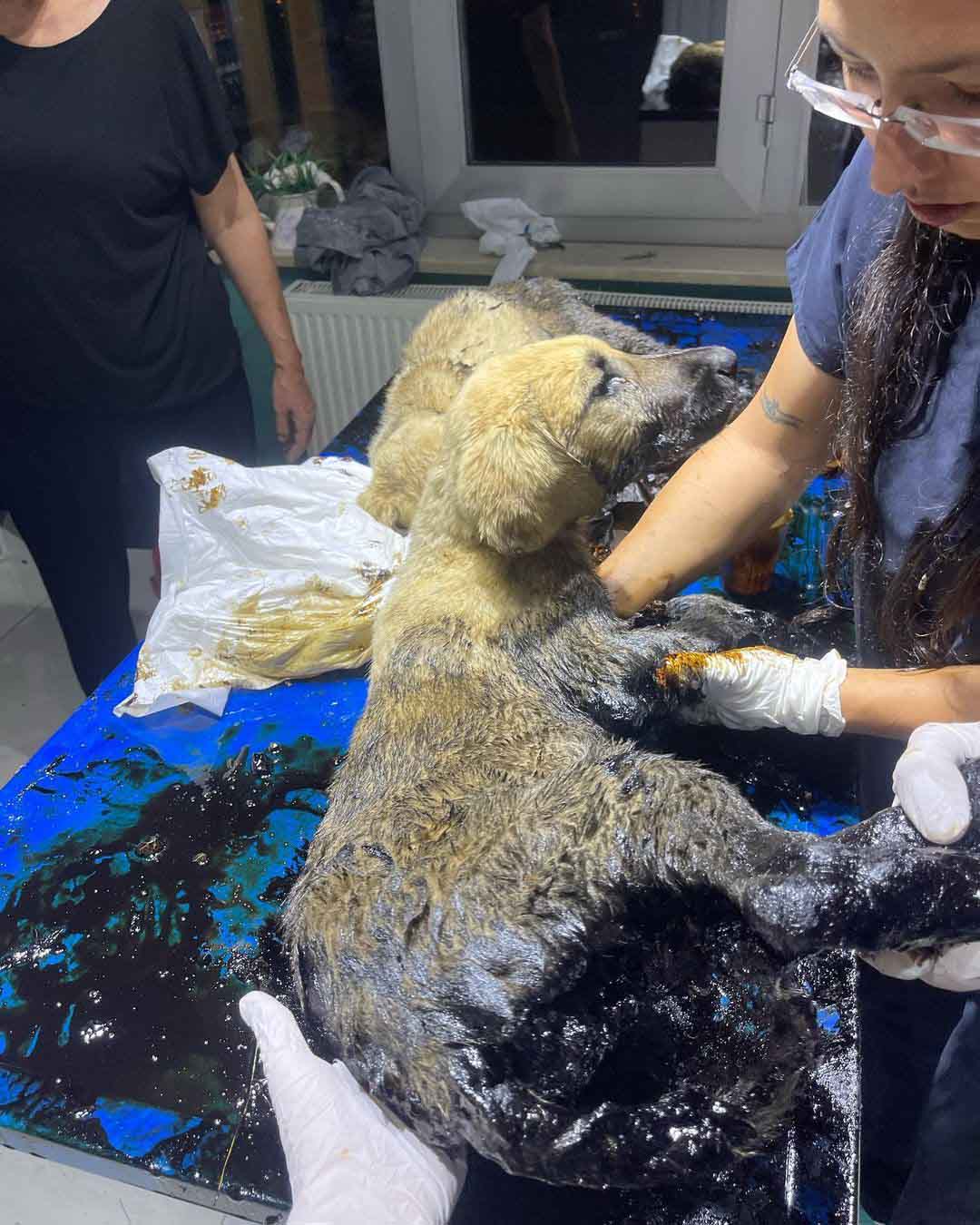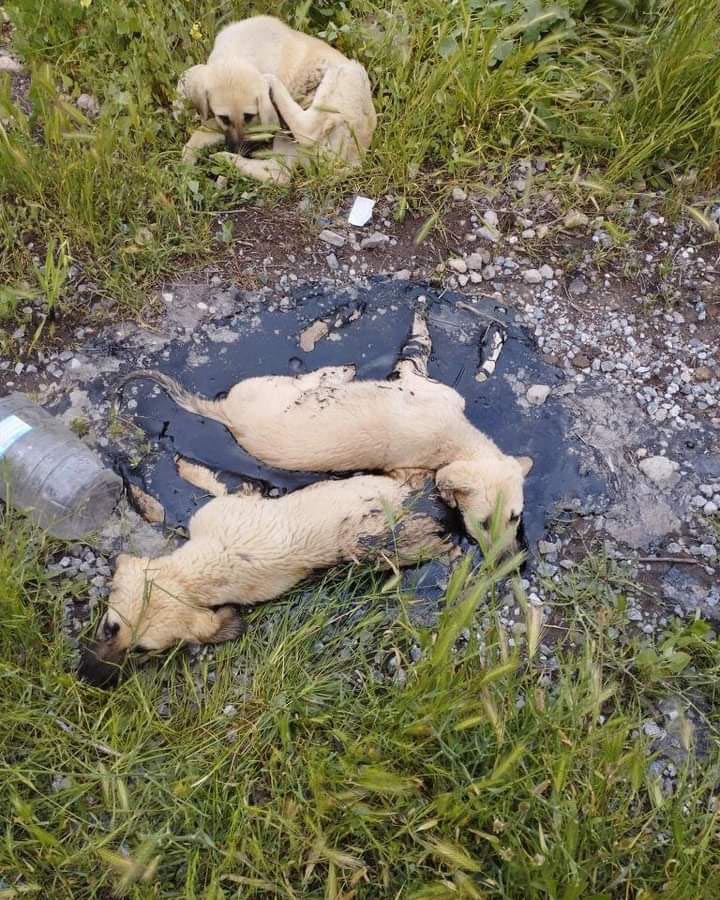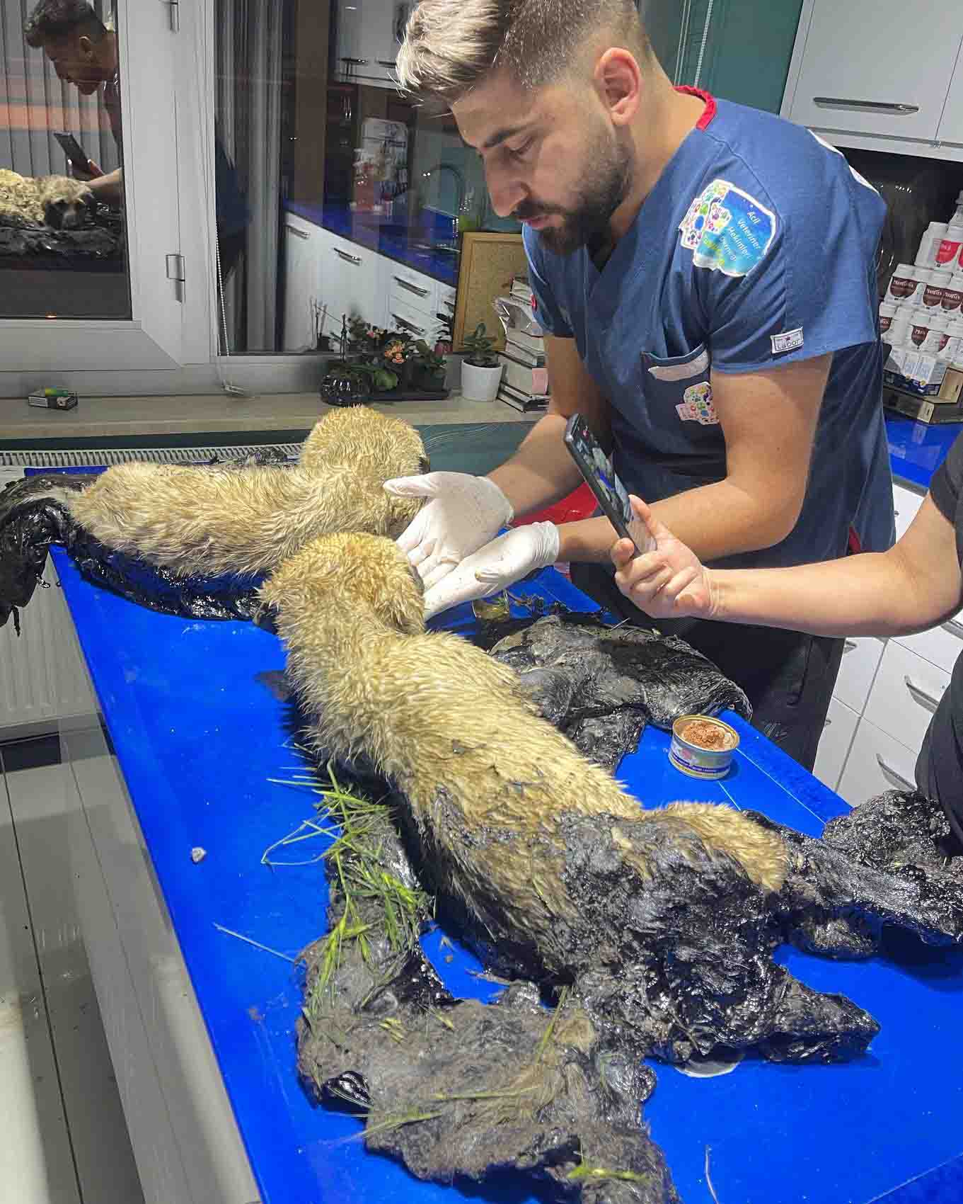 Öte yandan zifte yapışan yavru köpeklerin başında annelerinin beklemesi dikkati çekti.