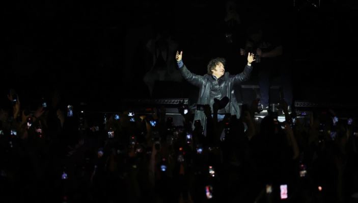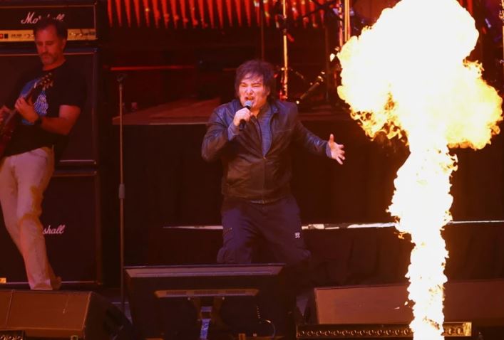Pazartesi gecesi Buenos Aires'teki Movistar Arena’da sahne alan Milei, binlerce destekçisinin tezahüratları eşliğinde rock şarkıları seslendirdi.