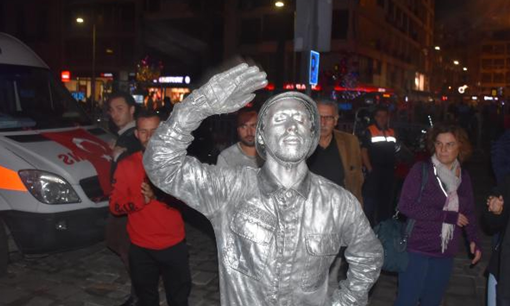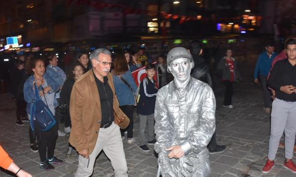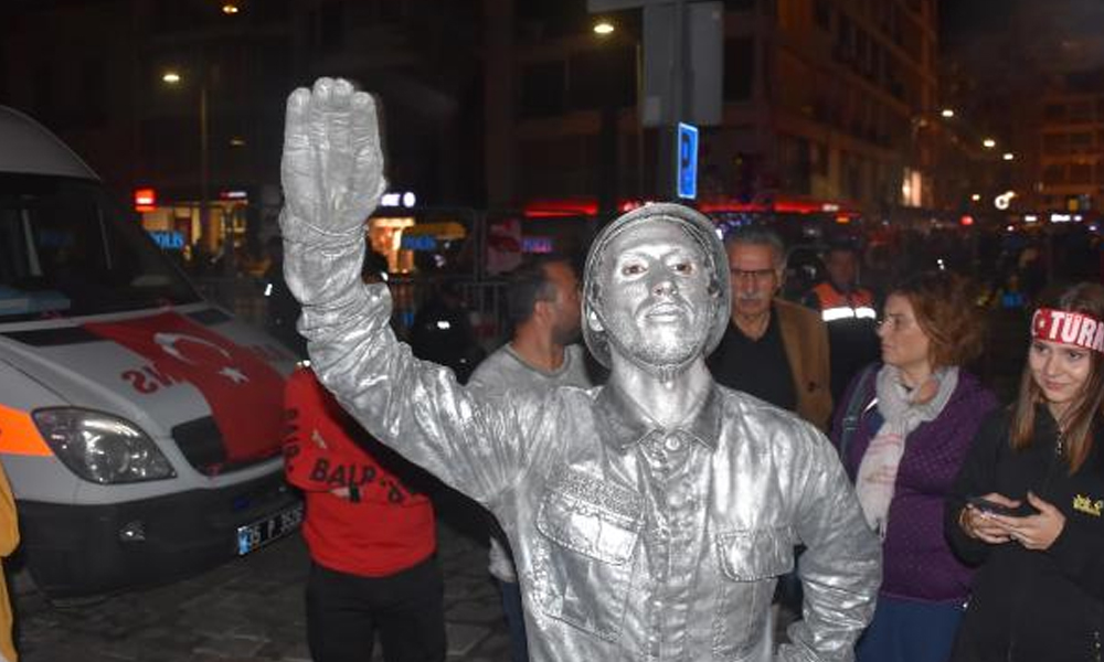 İzmir'de Gündoğdu Meydanı'nda, 29 Ekim Cumhuriyet Bayramı ve şehitler için rekor denemesi yapmak amacıyla dün akşam saat 19.00'da canlı heykel gösterisine başlayan performans sanatçısı Yunus İşçi (26), 24 saati doldurarak, gösterisini başarıyla tamamladı. Gösterinin ardından konuşan İşçi, üşüdüğünde Sarıkamış şehitlerini, açıktığında ise Çanakkale şehitlerini düşünerek kendini motive ettiğini belirterek şunları, söyledi: