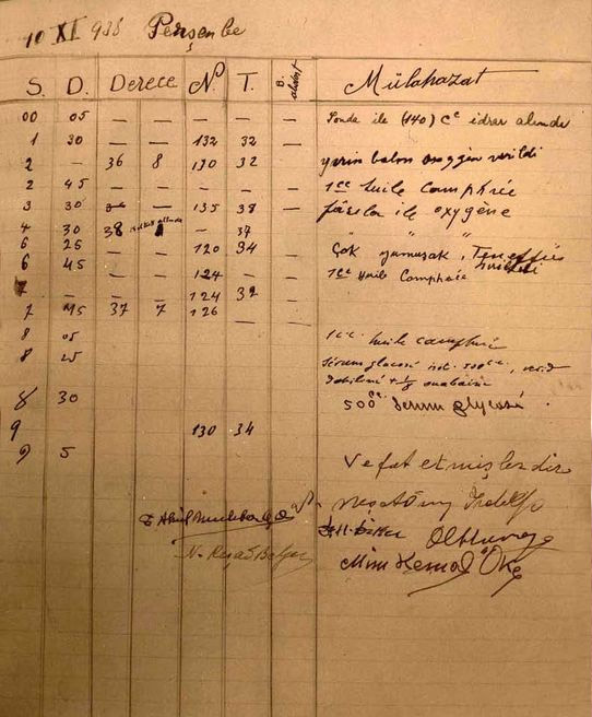 24 Ekim ile 10 Kasım 1938 arasındaki sağlık kayıtları. 10 Kasım sütununda “Saat 9.05’te vefat. Raporlara müracaat” yazılmış.