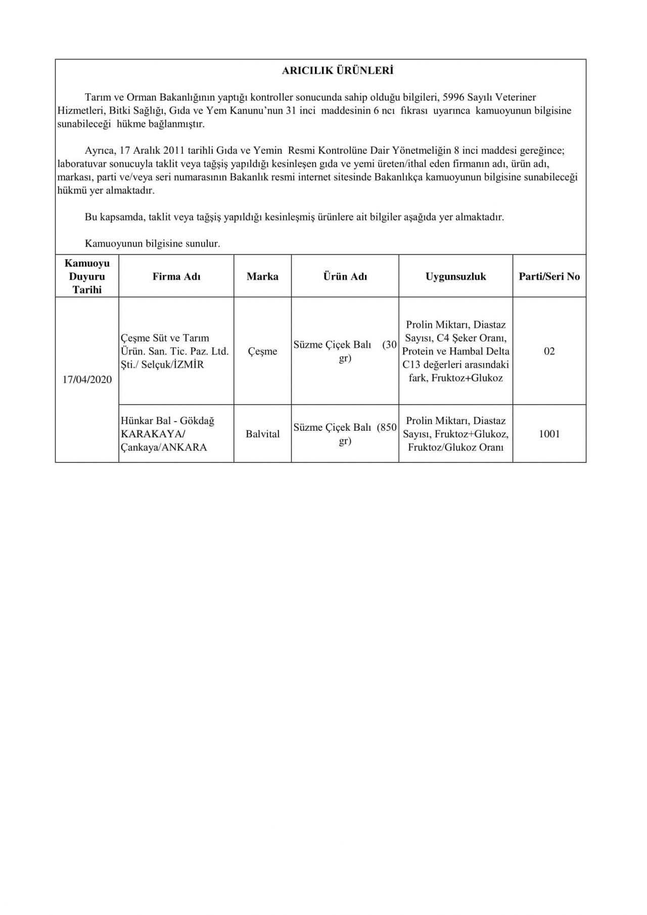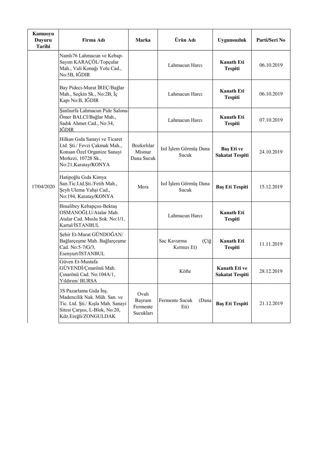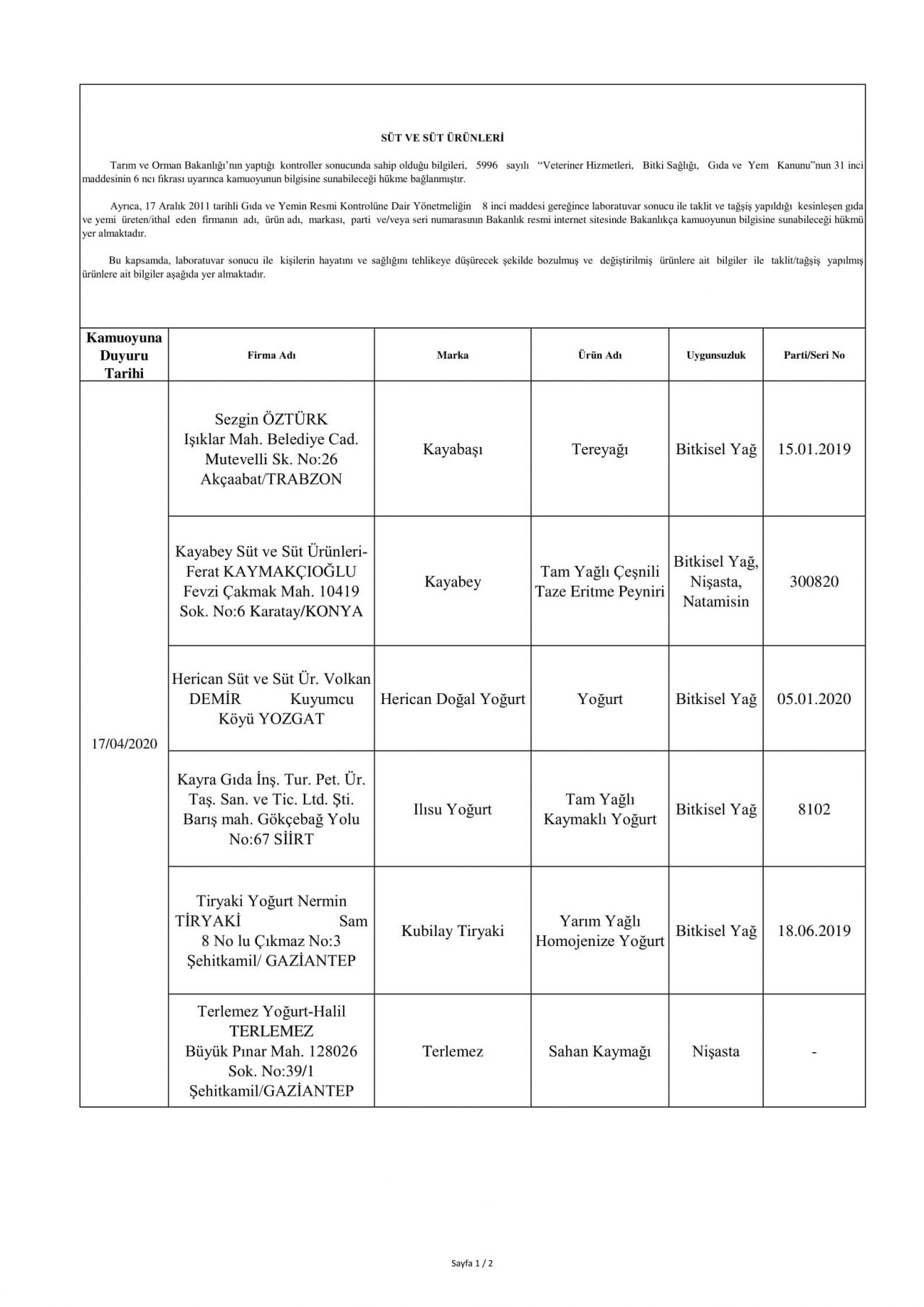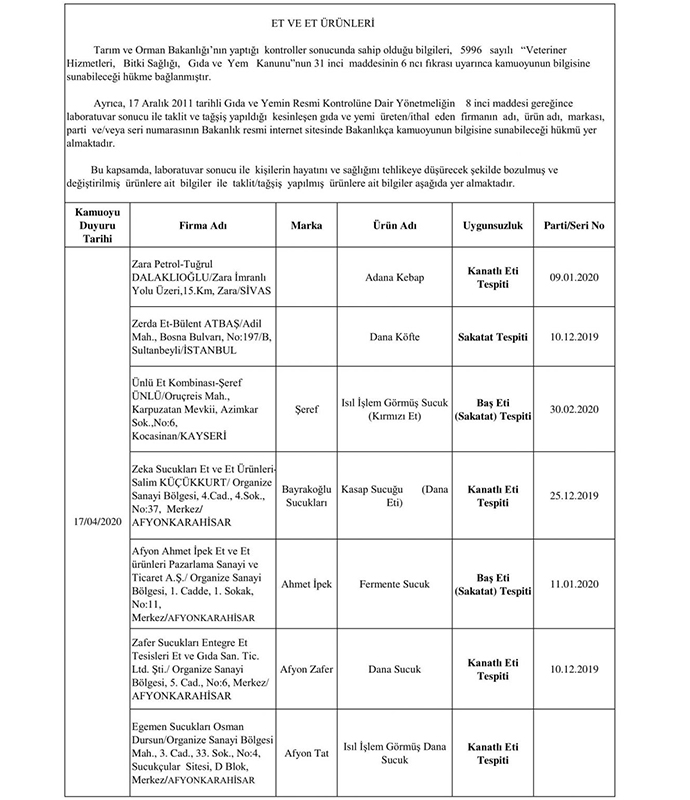 Bakanlığın internet sitesinde yer alan duyuruda, gıda ve gıdayla temas eden madde ve malzemelerin üretim, işleme ve dağıtımının tüm aşamalarında resmi kontrol faaliyetlerinin büyük titizlikle yürütüldüğü ifade edildi.