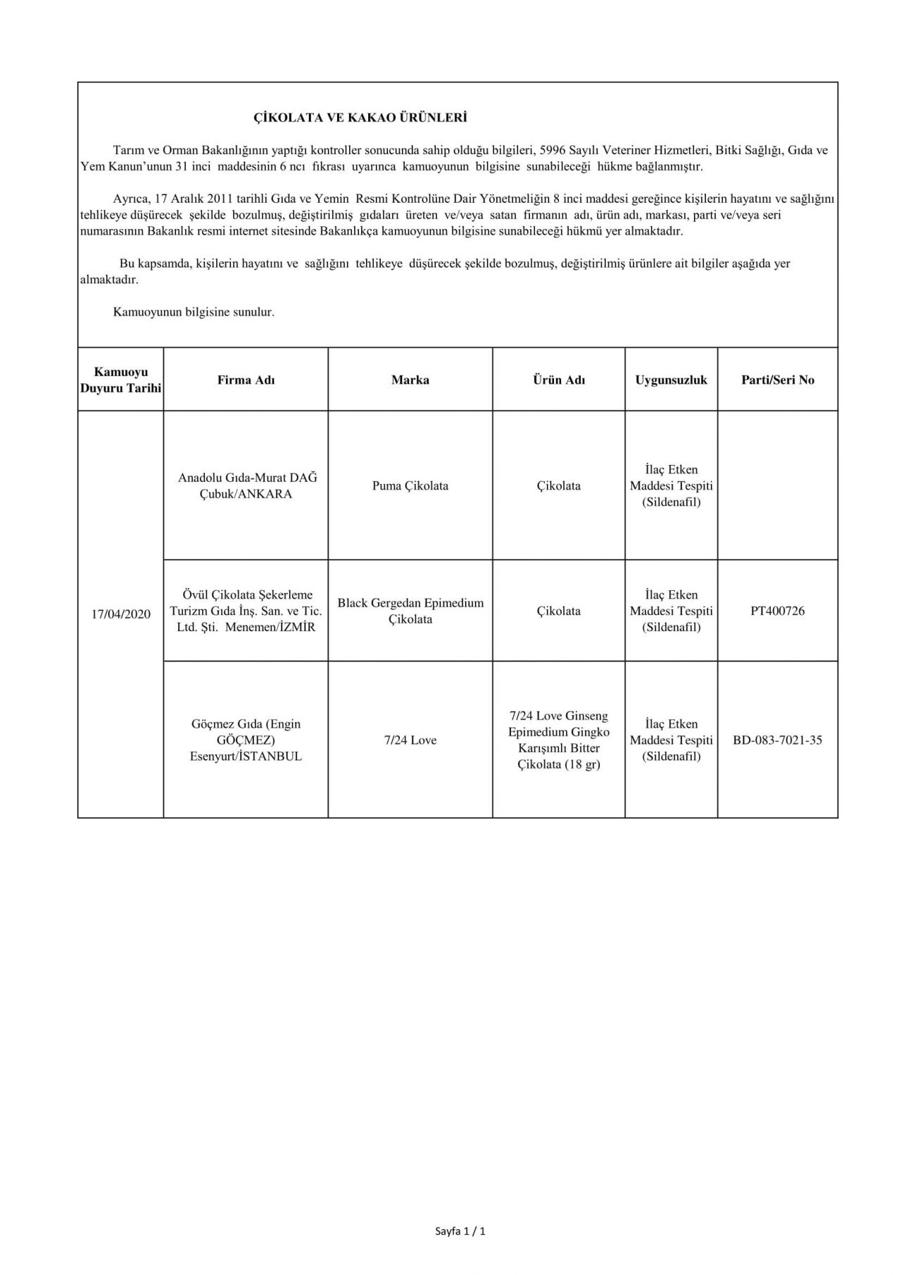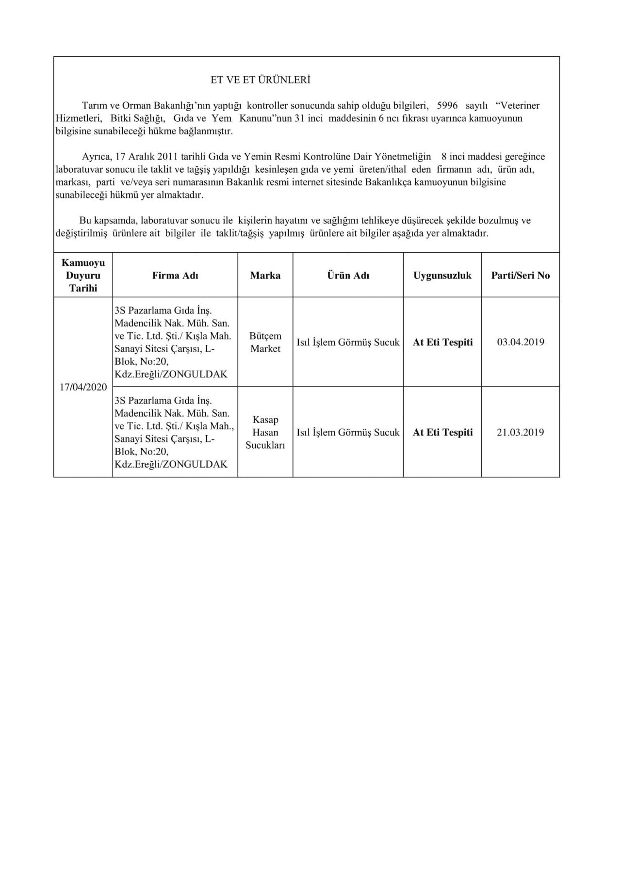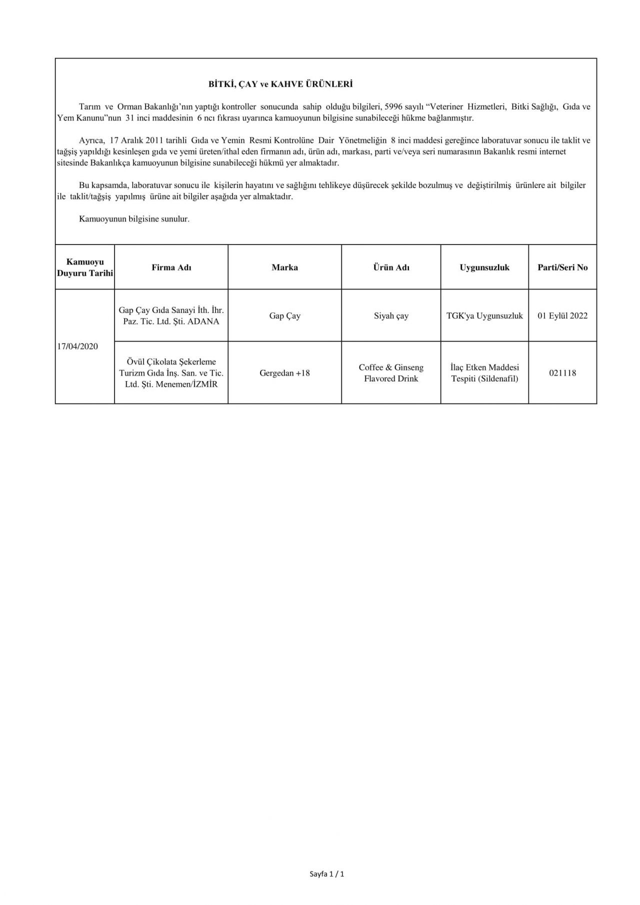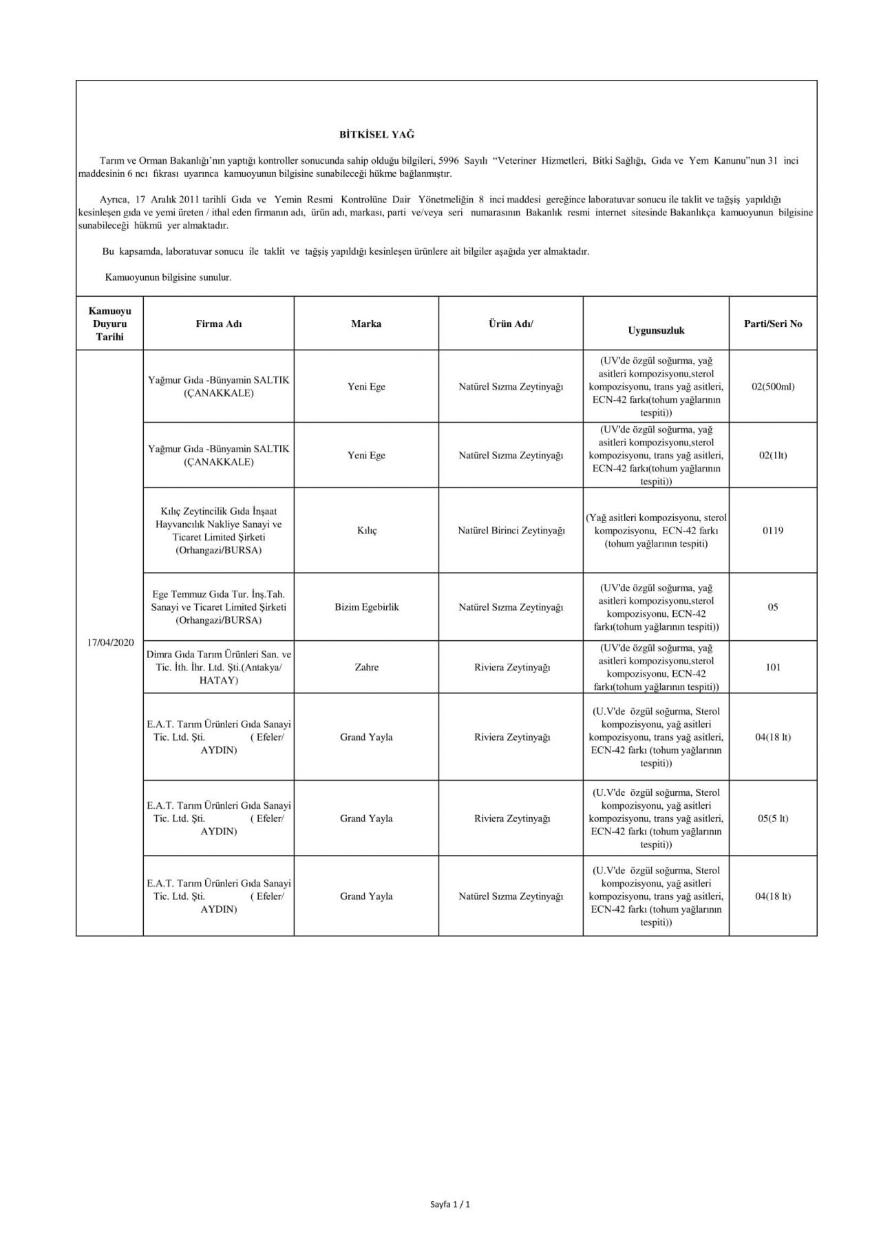 Bakanlığın internet sitesinde yer alan duyuruda, gıda ve gıdayla temas eden madde ve malzemelerin üretim, işleme ve dağıtımının tüm aşamalarında resmi kontrol faaliyetlerinin büyük titizlikle yürütüldüğü ifade edildi.
