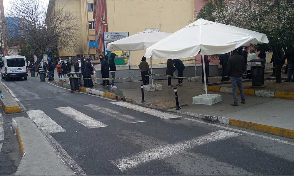Koronavirüs belirtileri gösterdiğini düşünüp test yaptırmak isteyenler Bakırköy Sadi Konuk Eğitim ve Araştırma Hastanesi'ne geliyor. Hastane bahçesinde test için gelenler uzun kuyruklar oluşturmaya devam ediyor. Kuyruk bugün daha da uzadı.