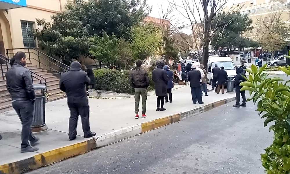 Polis ve hastane güvenlik görevlileri kuyrukta bekleyen vatandaşların olduğu alana güvenlik şeridi çekerek gerekli mesafe kuralını uygulamaya çalıştı.