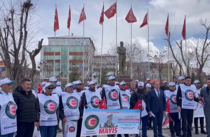 Ardahan'da Milli Egemenlik Parkı'ndaki Atatürk Anıtı önünde toplanan grup adına konuşan HAK-İŞ Ardahan Temsilcisi Serhat Yıldız, 1 Mayıs'ı kutlamak için toplandıklarını söyledi.