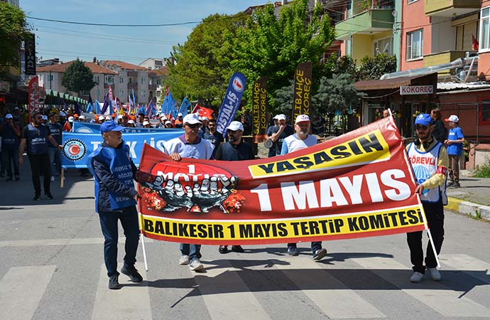 Balıkesir'de "1 Mayıs Emek ve Dayanışma Günü" dolayısıyla kutlama etkinlikleri yapıldı. Merkez Altıeylül ilçesindeki Çarşamba Pazarı'nda toplanan grup, 100. Yıl Caddesi boyunca sloganlar atarak yürüdü.