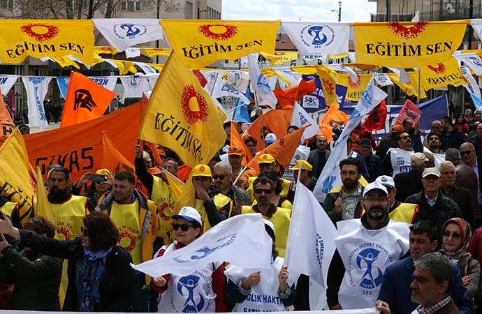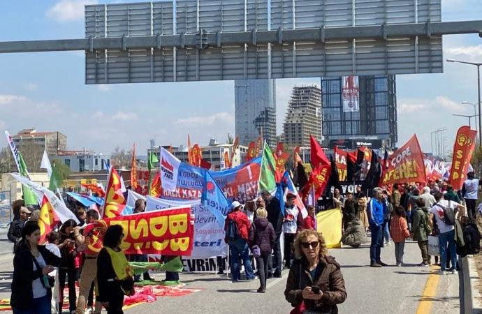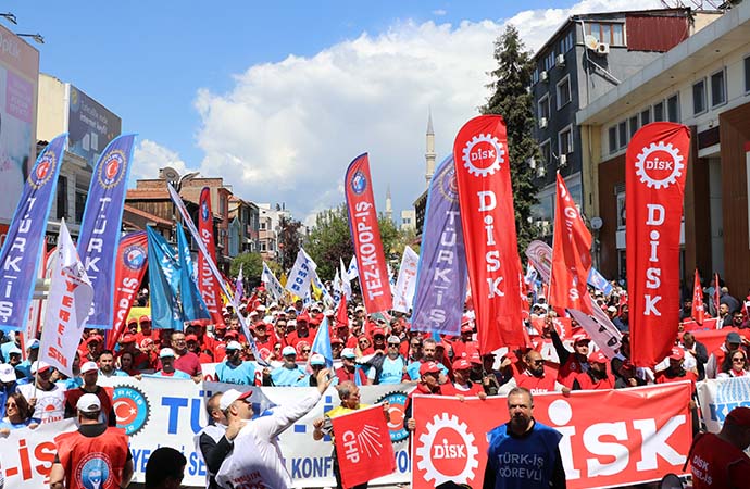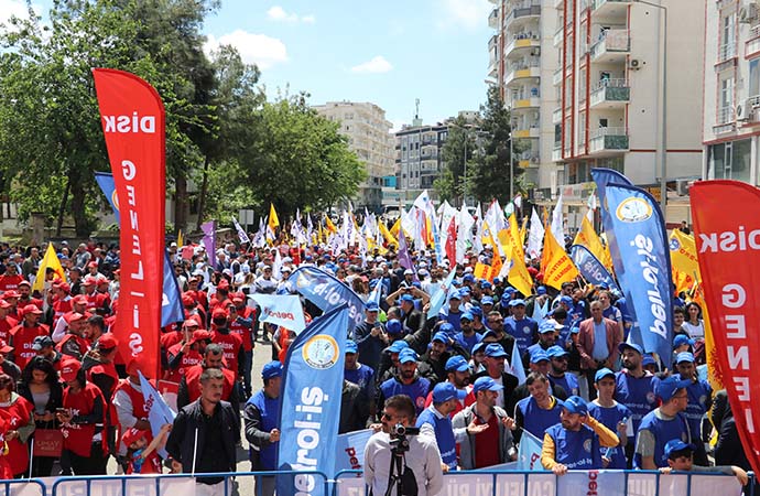 'Yaşasın iş, ekmek, özgürlük mücadelemiz', 'Bu devran bitecek', 'Bu böyle gitmez, sömürü devam etmez' dövizlerinin açıldığı yürüyüşte 'Söz yetki karar iktidar halka', 'Geleceğin sözünü gençler söyleyecek', 'Birleşe birleşe kazanacağız' sloganları atıldı.