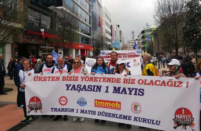Trabzon'da KESK Trabzon Şubeler Platformu, TMMOB Trabzon Şubeleri, Disk Trabzon Temsilciliği ve Trabzon Tabip Odası'nın oluşturduğu 1 Mayıs Tertip Komitesi'nin çağrısıyla Meydan Parkı'nda düzenlenecek miting için kortejler Tedaş Yokuşu'nda toplandı.