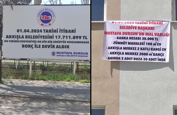 CHP’den AKP’ye geçen Akkışla Belediyesi’nin yeni başkanı Mustafa Dursun, AKP döneminden devralınan borcu billboardlara, kendi mal varlığını da belediye binasına astı.