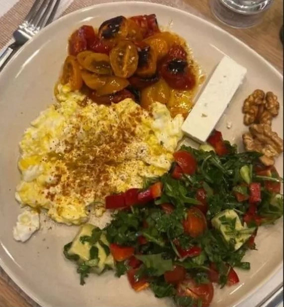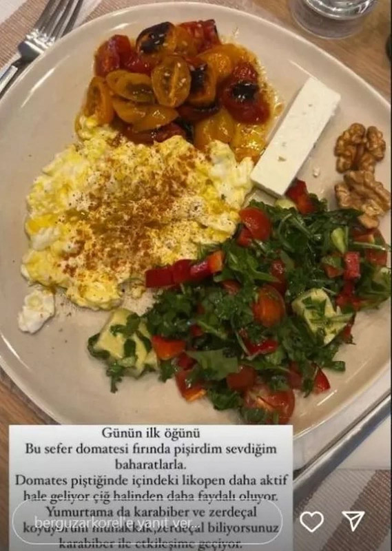 "Bu sefer domatesi sevdiğim baharatlarla fırında pişirdim. Domates piştiğinde içindeki likopen daha aktif hale geliyor. Çiğ halinden daha faydalı oluyor. Yumurtama da muhakkak karabiber ve zerdeçal koyuyorum. Biliyorsunuz zerdeçal karabiber ile etkileşime geçiyor."