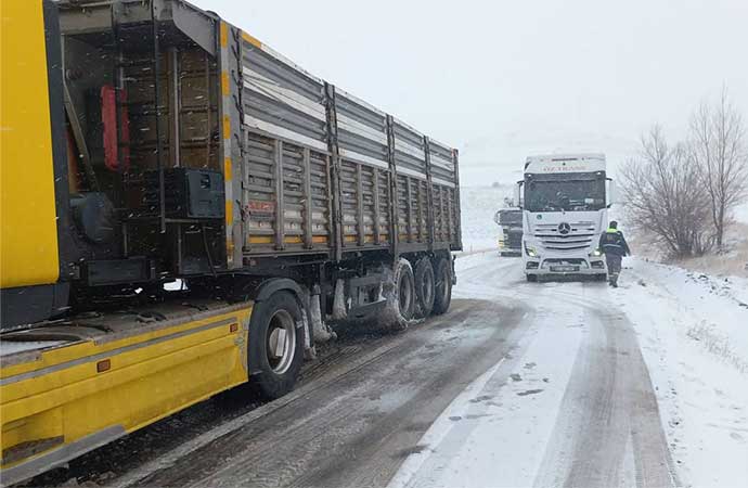 Yüksek kesimlerde yoğun kar yağışının meydana geldiği Sivas'ın Divriği ilçesindeki Karasar Geçidi’nde ağır tonajlı araçlar yolda kaldı. Polis ekipleri zincirsiz yola çıkan araçların geçişine izin vermedi. Yolda kalan araçlar için ekipler çalışma başlattı.
