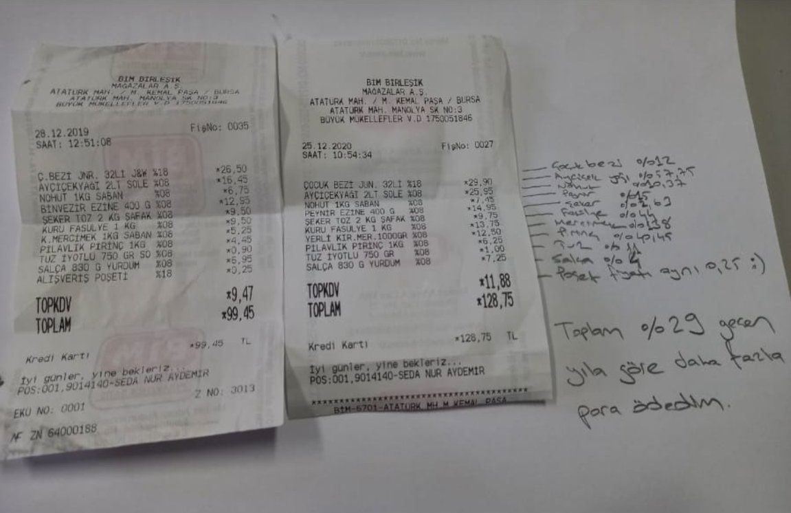 Sosyal medya hesabından paylaşım yapan "tüketici", geçen sene 99 lira 45 kuruşa aldığı ürünlerin aynılarını 1 sene sonra 128 lira 75 kuruşa satın aldı.