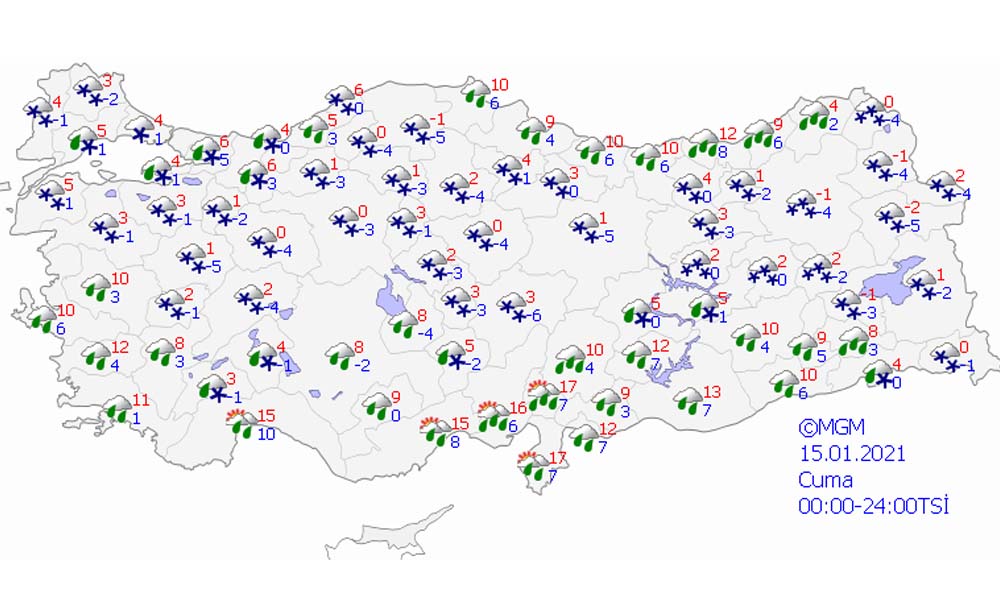 Meteoroloji'nin son dakika hava durumu raporunda Doğu Karadeniz ve Doğu Anadolu Bölgesi'ne sarı kodlu uyarıda bulunuldu. Bugün Trakya, Marmara’nın güneyi, İç Ege, Batı Akdeniz’in iç ve yüksek kesimleri, İç Anadolu, Karadeniz’in iç kesimleri ile Doğu Anadolu’da karla karışık yağmur ve kar yağışı bekleniyor. Meteoroloji'nin raporuna göre İstanbul'da kar yağışı yarın başlayacak.