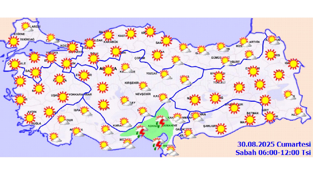 Meteoroloji Genel Müdürlüğü’nün (MGM) tahminlerine göre, 30 Ağustos Cumartesi günü ülkenin büyük bölümünde az bulutlu ve açık bir hava etkili olacak. Ancak Doğu Akdeniz ve Karadeniz’in doğusunda yer yer sağanak ve gök gürültülü sağanak yağışlar bekleniyor.