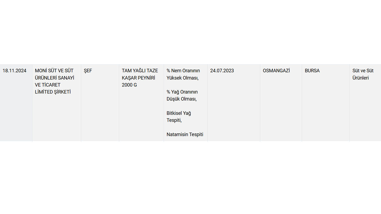Söz konusu üründe "% Nem Oranının Yüksek Olması, % Yağ Oranının Düşük Olması, Bitkisel Yağ, Natamisin" tespit edildi.