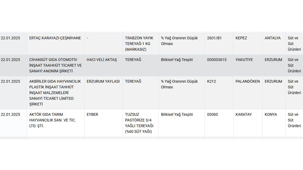 'Taklit veya Tağşiş Yapılan Gıdalar' listesine 22 Ocak'ta eklenen tereyağı satan firmalar şaşkınlığa neden oldu.