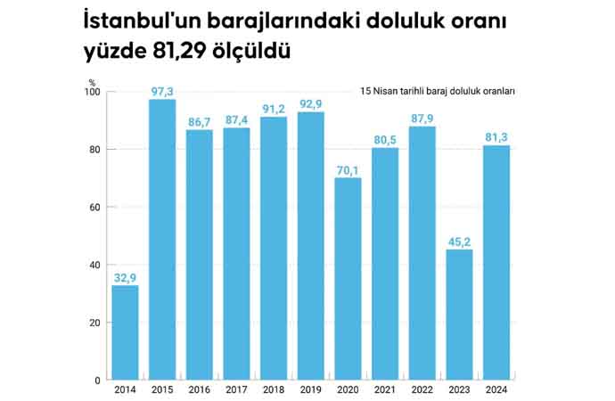 YILLARA GÖRE 15 NİSAN'DAKİ DOLULUK ORANLARI: İSKİ istatistiklerine göre, 15 Nisan tarihli baraj doluluk oranları 2014'te yüzde 32,95, 2015'te yüzde 97,32, 2016'da yüzde 86,69, 2017'de yüzde 87,38, 2018'de yüzde 91,21, 2019'da yüzde 92,93, 2020'de yüzde 70,07, 2021'de yüzde 80,48, 2022'de yüzde 87,91, 2023'te yüzde 45,18 iken, bugünkü oran yüzde 81,29 olarak kayıtlara geçti.