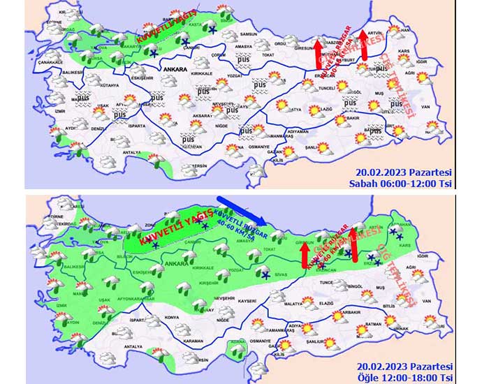 Meteoroloji Genel Müdürlüğü tarafından yapılan son değerlendirmelere göre 20 Şubat Pazartesi günü için; ülkemiz genelinin parçalı ve çok bulutlu, Marmara’nın doğusu, Ege, İç Anadolu’nun kuzeyi, Karadeniz, Doğu Anadolu’nun kuzeyi ile Kırklareli kıyıları, Çanakkale’nin iç kesimleri, Balıkesir, Antalya’nın doğu kıyıları, Van'nın batısı, Nevşehir, Aksaray, Nevşehir, Niğde, Kayseri, Adana, Hatay, Osmaniye, Bitlis, Batman, Siirt çevreleri ve Diyarbakır'ın doğusunun aralıklı yağışlı geçeceği tahmin ediliyor.