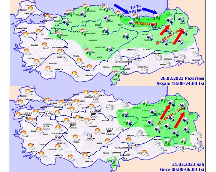 Yağışların; genellikle yağmur ve sağanak, Batı ve Doğu Karadeniz’in iç kesimleri ile Doğu Anadolu’nun kuzey kesimlerinde karla karışık yağmur ve kar şeklinde olması bekleniyor. Yağışların Batı Karadeniz ile Sakarya çevreleri, Doğu Karadeniz ile Ordu çevrelerinde yerel olmak üzere kuvvetli olacağı tahmin ediliyor. İç ve doğu kesimlerde buzlanma ve don olayı ile birlikte yer yer pus ve sis bekleniyor. Doğu Karadeniz’in iç kesimleri ile Doğu Anadolu’nun eğimli ve yüksek yamaçlarda çığ tehlikesi riski bulunmaktadır.