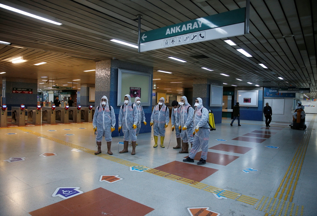 Ankaralıların güvenli ve hijyenik bir ortamda seyahat etmelerini sağlamak amacıyla hummalı bir temizlik çalışması yürüten ekipler, daha sonra viral enfeksiyon ve virüslere karşı dezenfekte işlemi gerçekleştirdi.