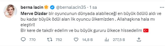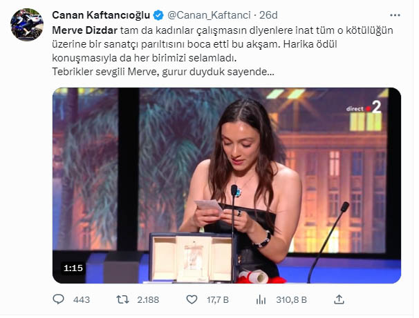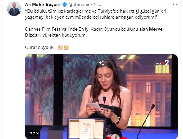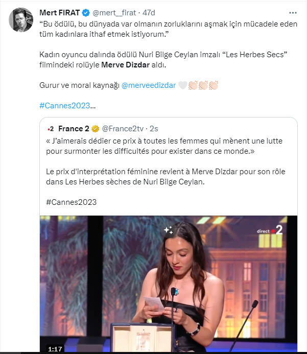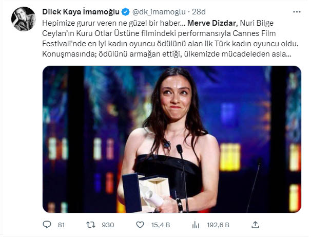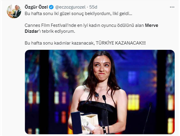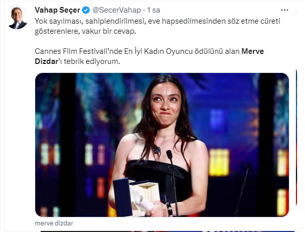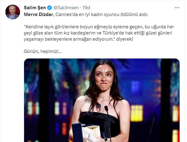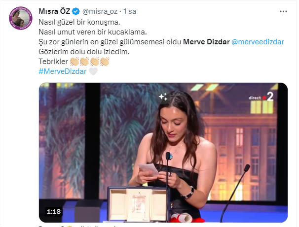 Cannes’da En İyi Kadın Oyuncu ödülü alan Merve Dizdar’a tebrik mesajları yağıyor!