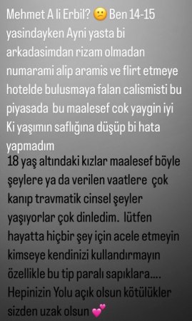 "Mehmet Ali Erbil? Ben 14-15 yaşındayken aynı yaşta bir arkadaşımdan rızam olmadan numaramı alıp aramış ve flört etmeye, otelde buluşmaya falan çalışmıştı. Bu piyasada bu maalesef çok yaygın. İyi ki yaşımın saflığına düşüp bir hata yapmadım. 18 yaş altındaki kızlar maalesef böyle şeylere ya da verilen vaatlere çok kanıp travmatik cinsel şeyler yaşıyorlar, çok dinledim. Lütfen hayatta hiçbir şey için acele etmeyin. Kimseye kendinizi kullandırtmayın. Özellikle bu paralı sapıklara... Hepinizin yolu açık olsun, kötülükler sizden uzak olsun.”