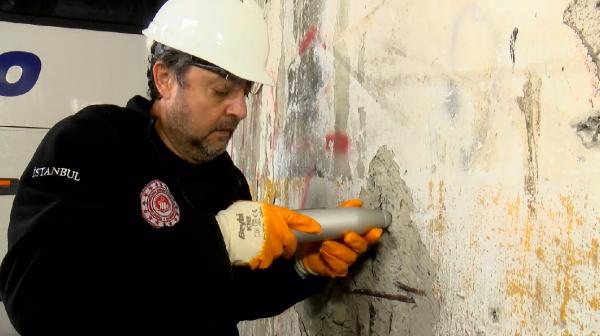 Ekipler, betonun genel durumuna bakmak için önce kolonların üzerindeki pas payını döktü ardından da sağlam betona ulaşarak dayanımı ölçtü.