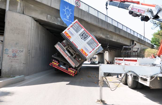 Köprüye sıkışan kamyon, vinç ile 1 saatlik çalışmayla kurtarıldı. Çevredekiler çalışmaları cep telefonuyla görüntüledi.