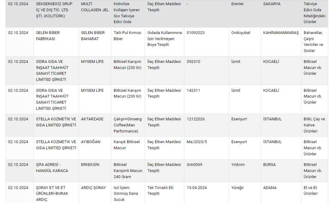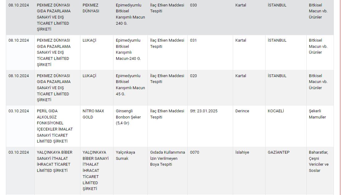 İlaç etken maddesinin Küçükçekmece'deki bir işletme 15 gr şase formunda bir balın içinde dahi çıktığı kaydedilirken, efervesan tablet, padişah macunu, mesir macunu, bitkisel karışımlı macun, ballı bitki macun ve epimedyumlu bitkisel macun gibi ürünlerde de bu etken madde bulundu.