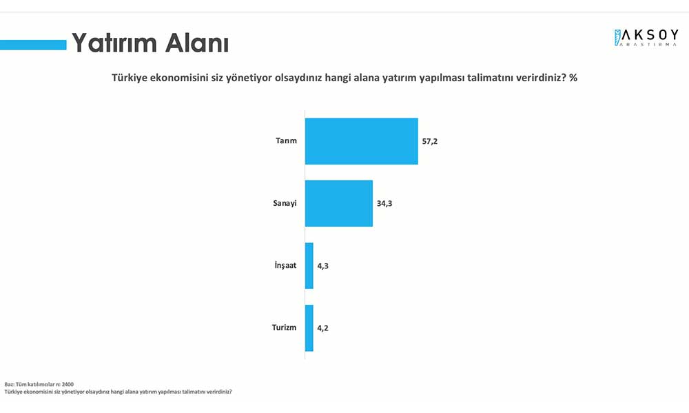 Türkiye ekonomisini siz yönetiyor olsaydınız hangi alana yatırım yapılması talimatını verirdiniz?" sorusuna vatandaşın yanıtı tarım ve sanayi oldu.