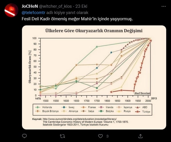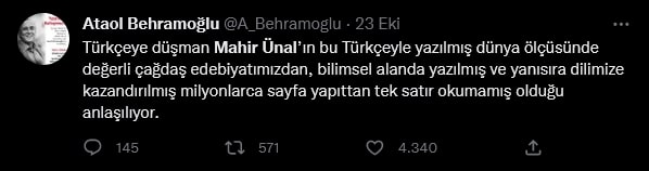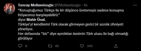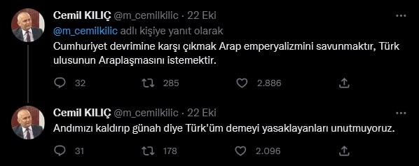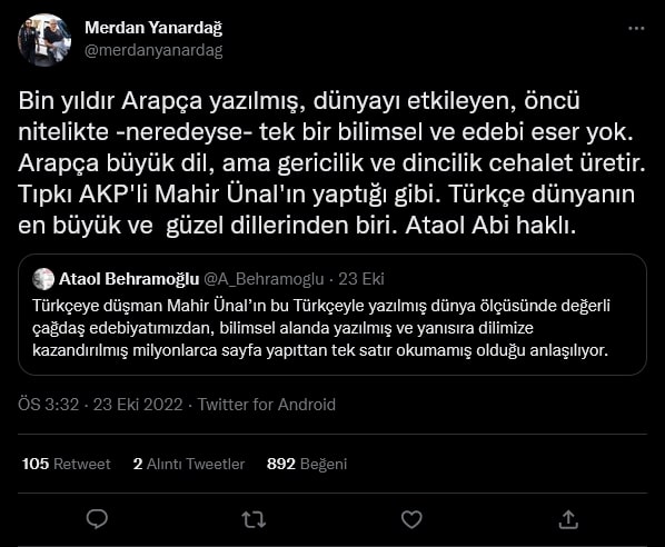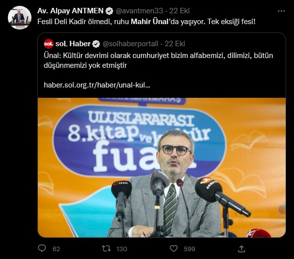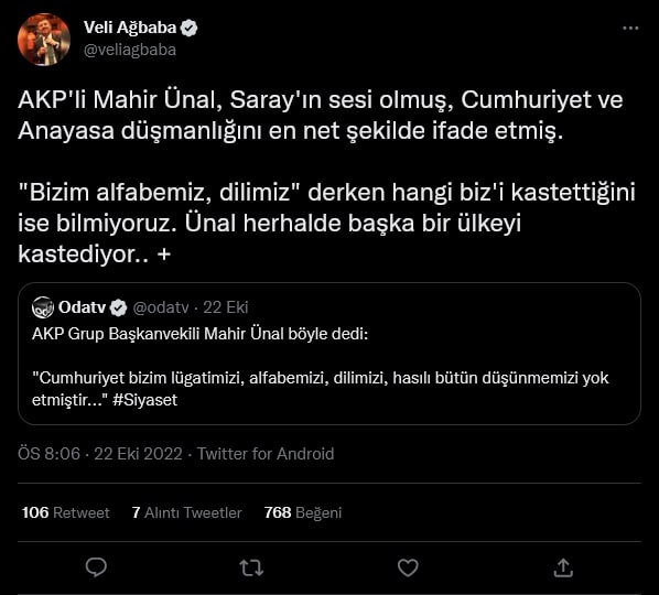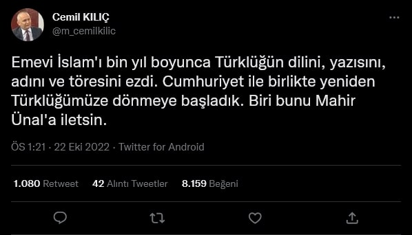 AKP Grup Başkanvekili Mahir Ünal, 22 Ekim'de Kahramanmaraş'ta katıldığı bir etkinlikte, "Bir kültür devrimi olarak Cumhuriyet; bizim lügatimizi, alfabemizi, dilimizi hasılı bütün düşünme setlerimizi yok etmiştir” dedi.