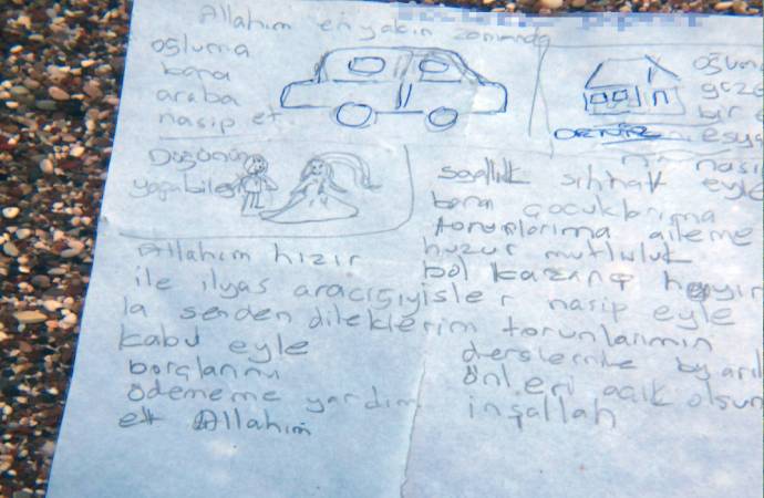 Çoğunluğunda borçlarını ödemede kolaylık, sağlık ve mutluluk dilenen kağıtlarda 'Dünyayı içime sine sine gezmek istiyorum', 'Yurt dışında yüksek lisans', '2022 model cip', 'Yazlık ev', '60 yataklı huzur evi', '60 yataklı çocuk sığınma evi', 'Dudağıma dolgu ve burnum estetikli olsun', 'Bodrum'da yazlık evim olsun' yazılı dilekler yer aldı.