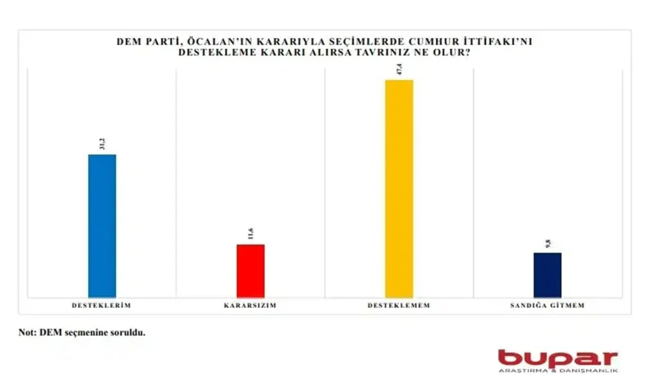Sonuçlara göre, DEM Parti seçmenlerinin büyük çoğunluğu, partilerinin terör örgütü PKK lideri Abdullah Öcalan’ın olası çağrısı doğrultusunda Cumhur İttifakı’nı destekleme kararı alması durumunda bile bu ittifaka oy vermeyeceğini ifade etti.