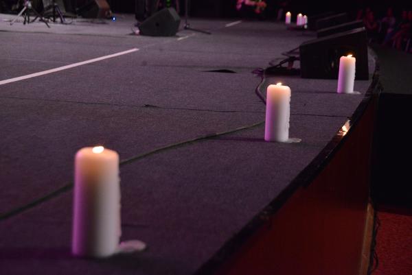 Sahnenin en ön kısmına depremde hayatını kaybeden 7 koro üyesi için 7 mum konuldu.