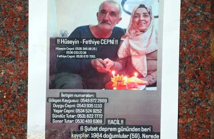 Antakya meydanındaki Atatürk büstünün kaidesindeki Hüseyin-Fethiye Çepni çiftine ait fotoğraflı ilanda, 59 yaşındaki çiftin, depremin olduğu 6 Şubat'tan beri kayıp oldukları belirtildi. Üzerinde yakınlarına ait isim ve iletişim numaraları olan ilanda, 'Nerede olduklarına dair hiçbir bilgi bulunmuyor. Lütfen yayalım, bir an önce ulaşalım' ifadeleri yer aldı.