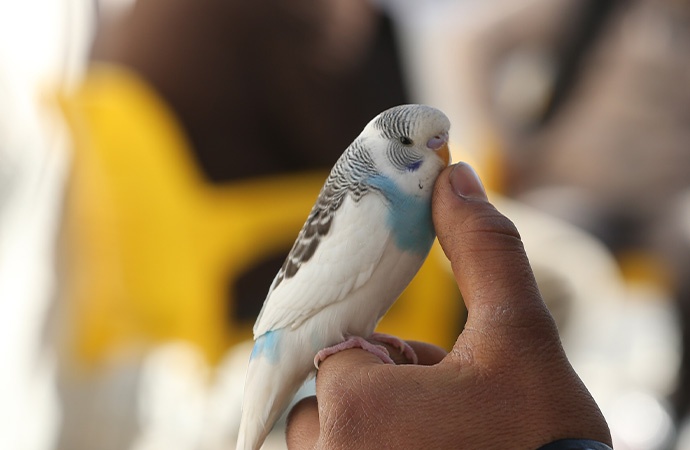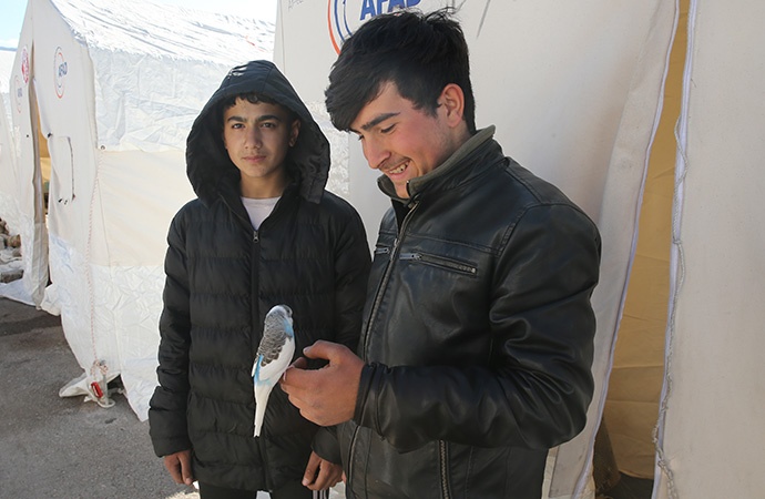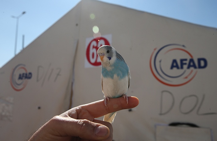 Kafes dışında da besledikleri muhabbet kuşunun insanlardan kaçmadığın aktaran Çimen, "Çadır kentin maskotu oldu." dedi.