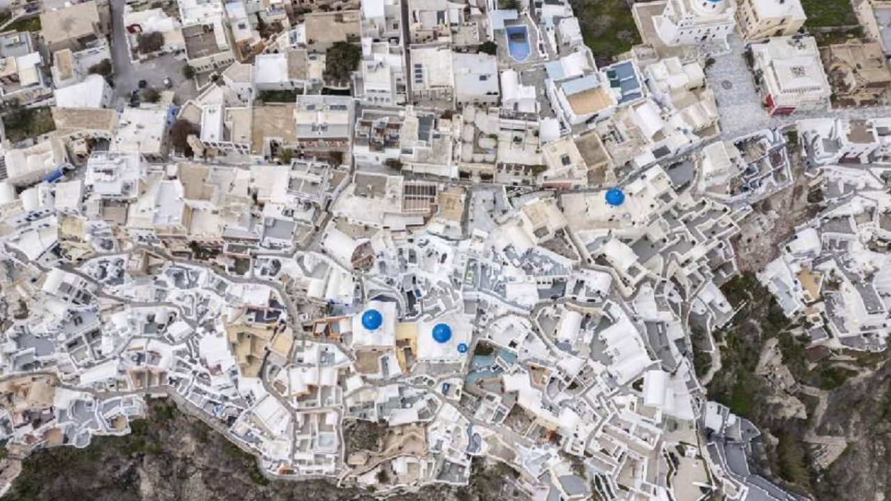 Ada genelinde yaşanan sismik ve volkanik hareketlilik nedeniyle olağanüstü hal ilan edilirken, sakinlerinin de terk ettiği Fira Kasabası dron destekli görüntülerle havadan görüntülendi.