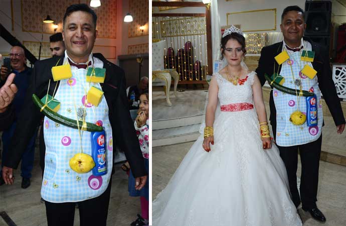 Antalya'da arkadaşlarının şaka yapmak için damat kaporta ustası Ömür Ünal'a takı olarak bulaşık deterjanı ve süngeri ile salatalık ve ayva takmaları düğünde eğlenceli anlar yaşattı.