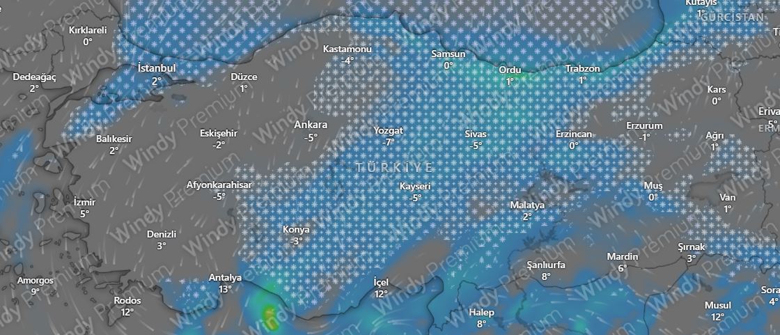 Windy'nin hava tahmin raporuna göre önümüzdeki hafta Marmara İç Anadolu ve Doğu Anadolu'da yoğun karlı bir havanın etkili olacağını gösterdi.