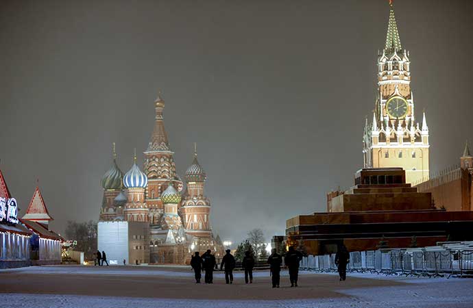 Rusya'nın başkenti Moskova, 2022 yılına havai fişek gösterileriyle merhaba dedi. Yeni yılın ilk saatlerinden itibaren şiddetli kar yağışı başkentte hakim oldu. Başkentin önemli merkezi tarihi Kızıl Meydan beyaza büründü.