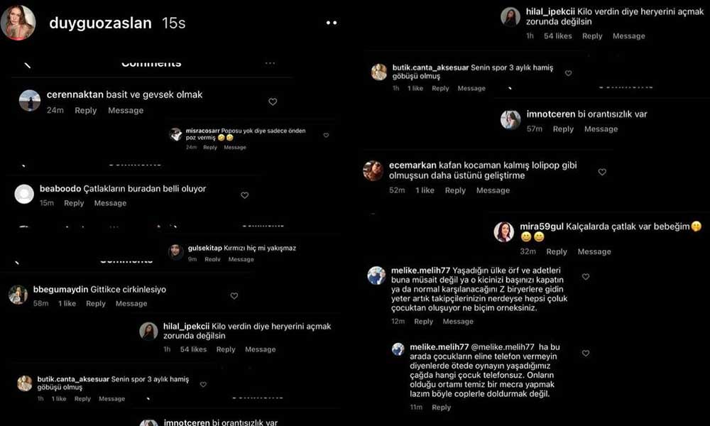 Özaslan, gelen kötü yorumları sosyal medya hesabı Instagram'ın hikaye kısmından paylaştı. Özaslan'a gelen tepkilerin çok sayıda olması dikkatlerden kaçmadı.