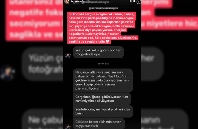 Duygu Özaslan, bir takipçisinden gelen çirkin bir mesajı ise Instagram hesabının hikaye bölümünden ifşa ederek, söz konusu mesaja sert yanıt verdi.