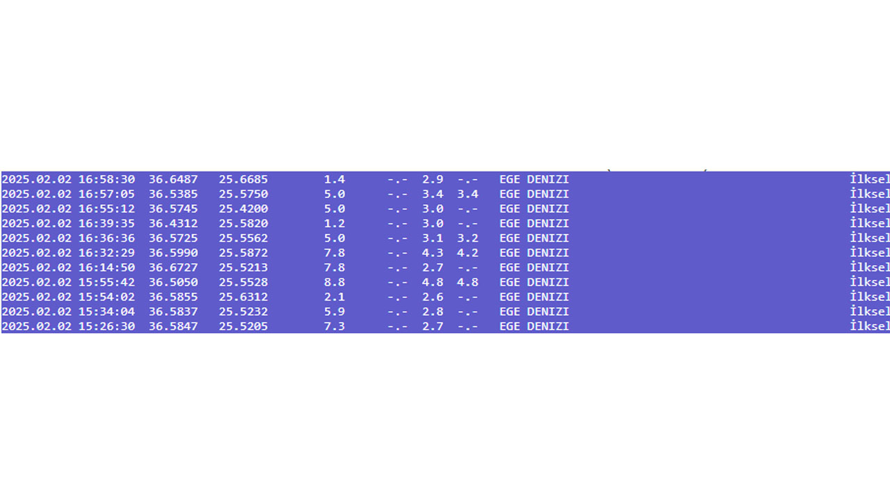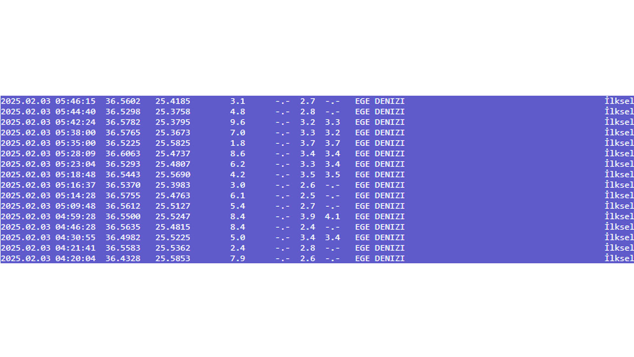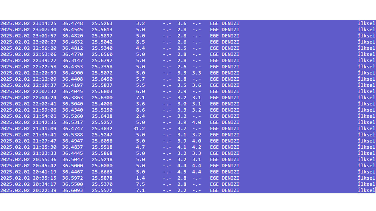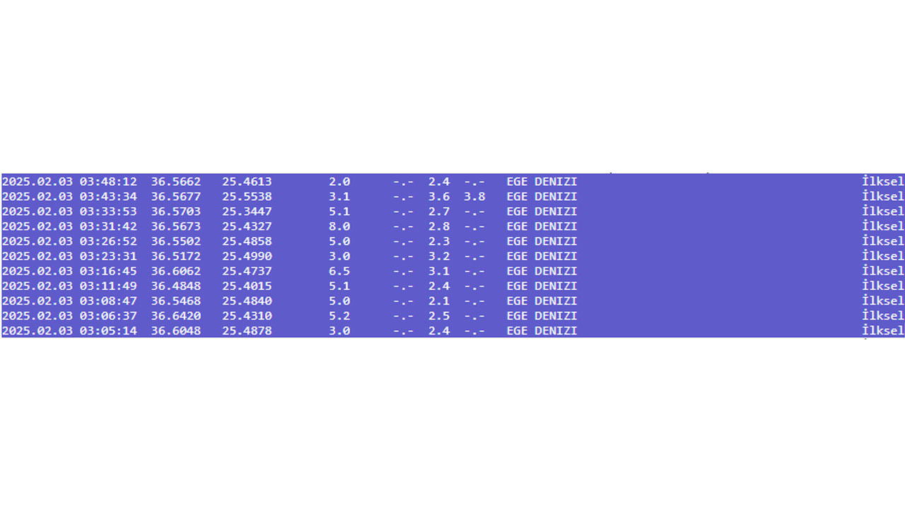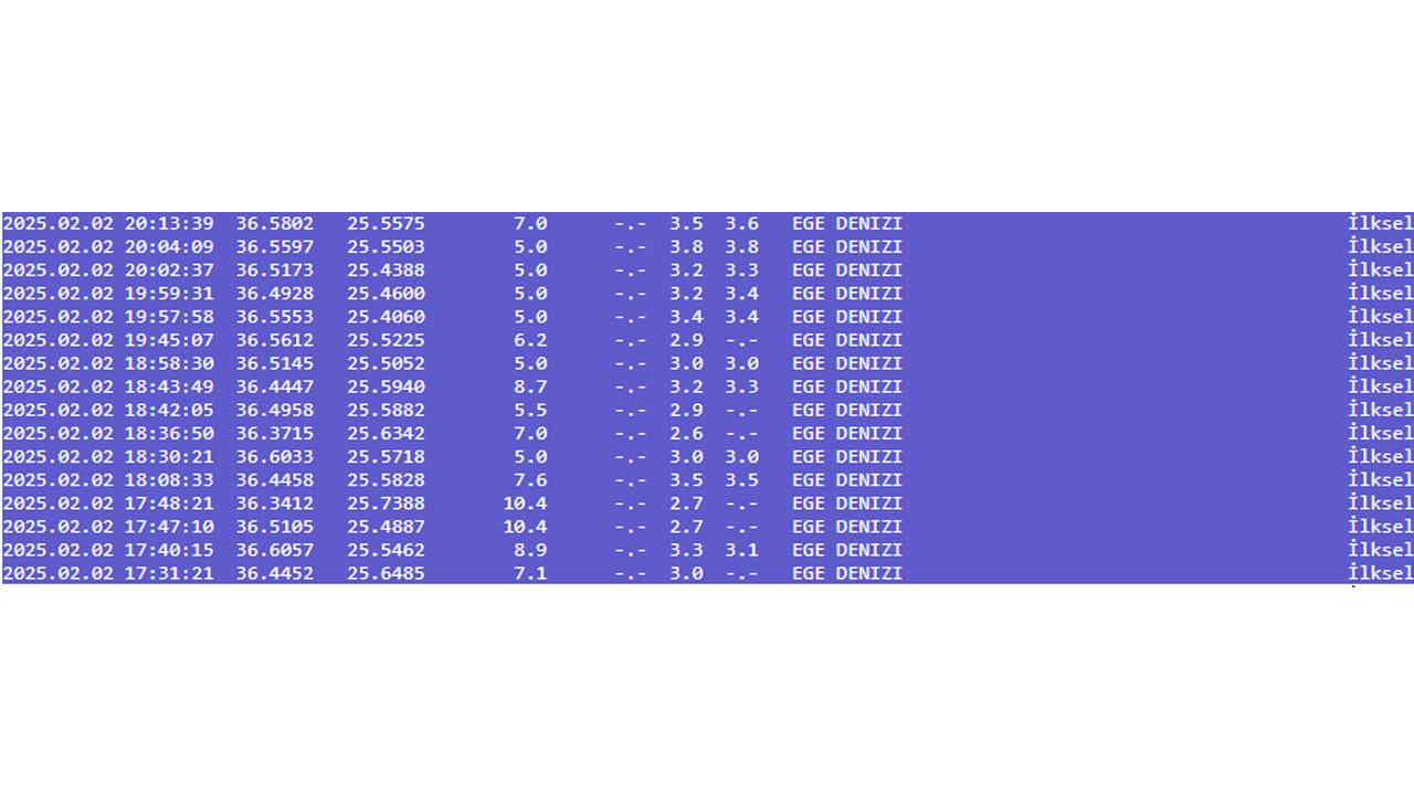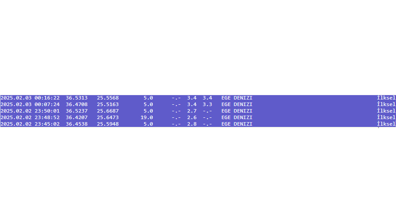 Ege Denizi'nde peş peşe meydana gelen depremler paniğe neden oldu. Ege Denizi'nde 2 Şubat Pazar günü (dün) saat 13.00 ile 3 Şubat Pazartesi günü bugün saat 12.45 arasında meydana gelen depremleri derledik. İşte son 24 saatteki depremlerin büyüklüğü...