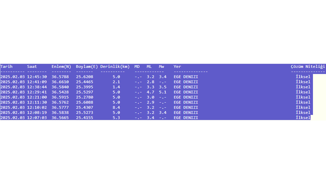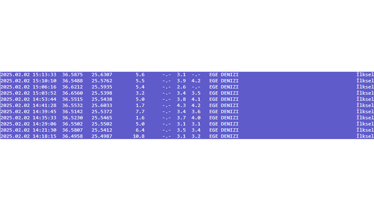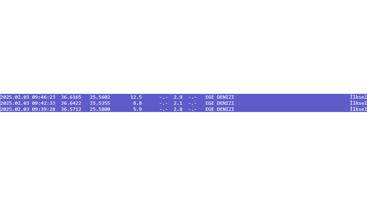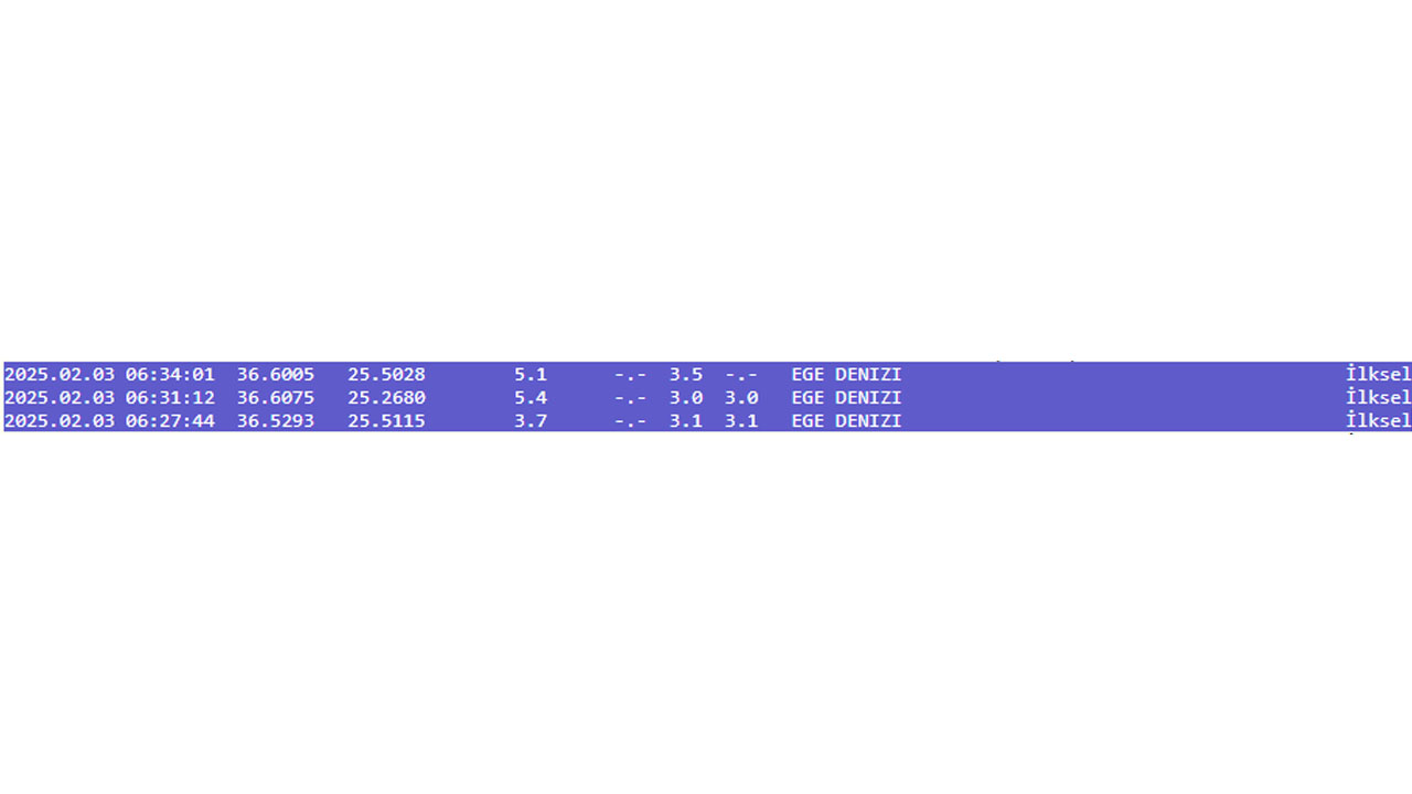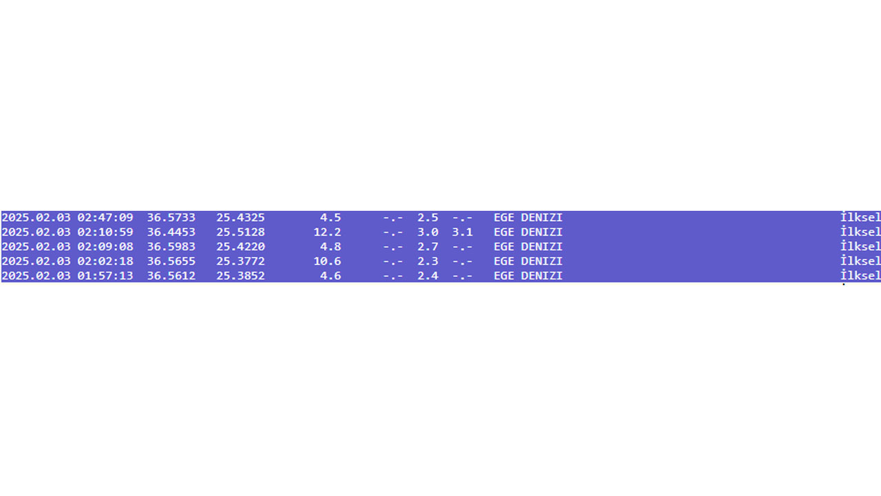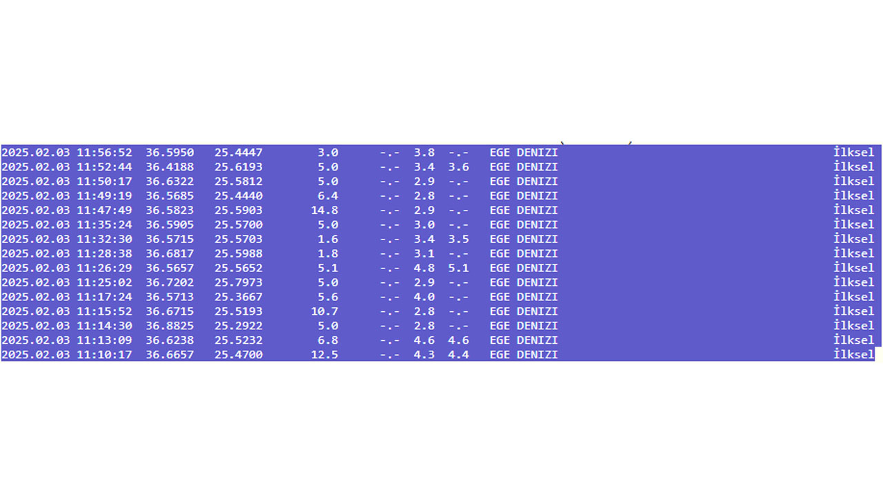Ege Denizi'nde peş peşe meydana gelen depremler paniğe neden oldu. Ege Denizi'nde 2 Şubat Pazar günü (dün) saat 13.00 ile 3 Şubat Pazartesi günü bugün saat 12.45 arasında meydana gelen depremleri derledik. İşte son 24 saatteki depremlerin büyüklüğü...
