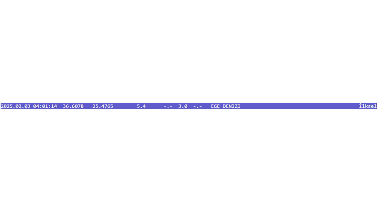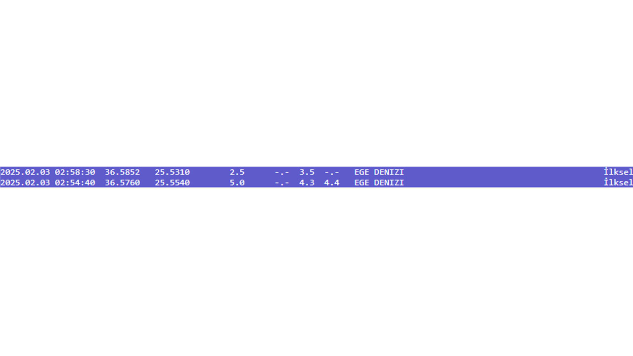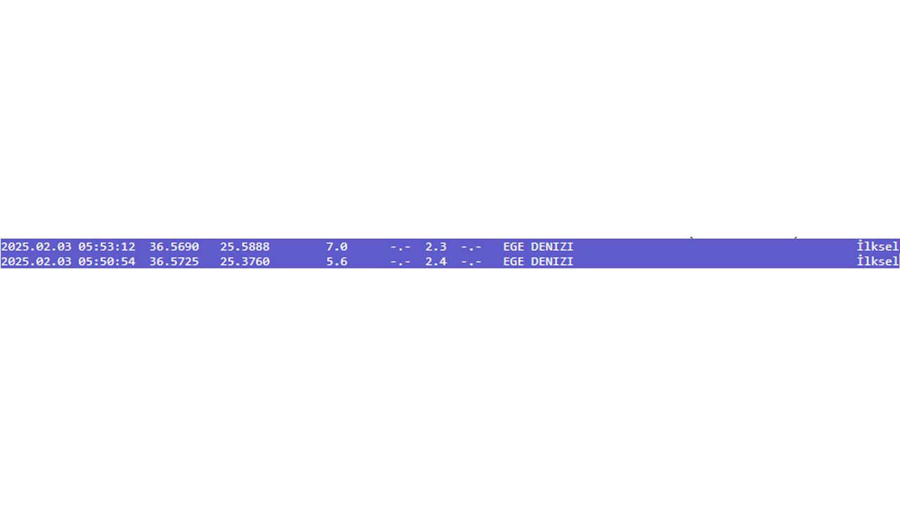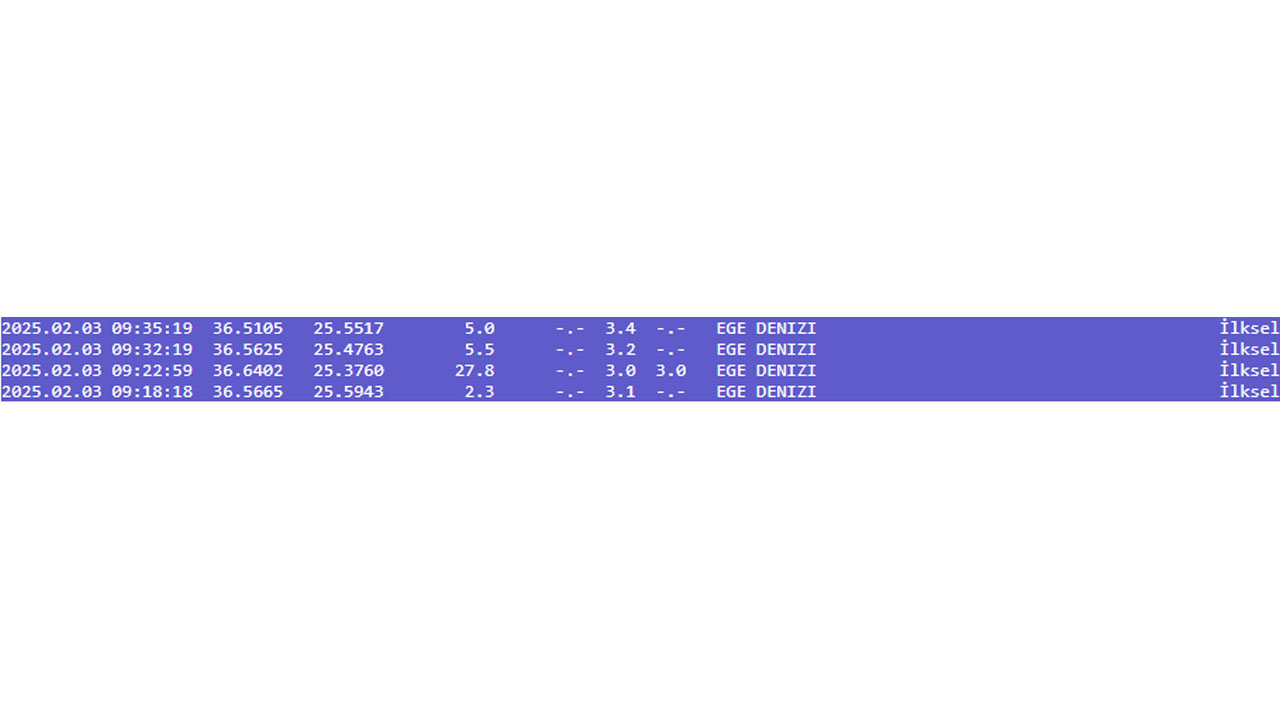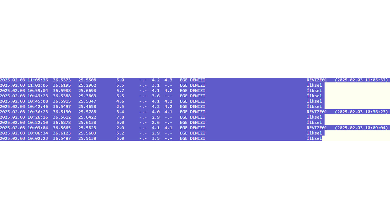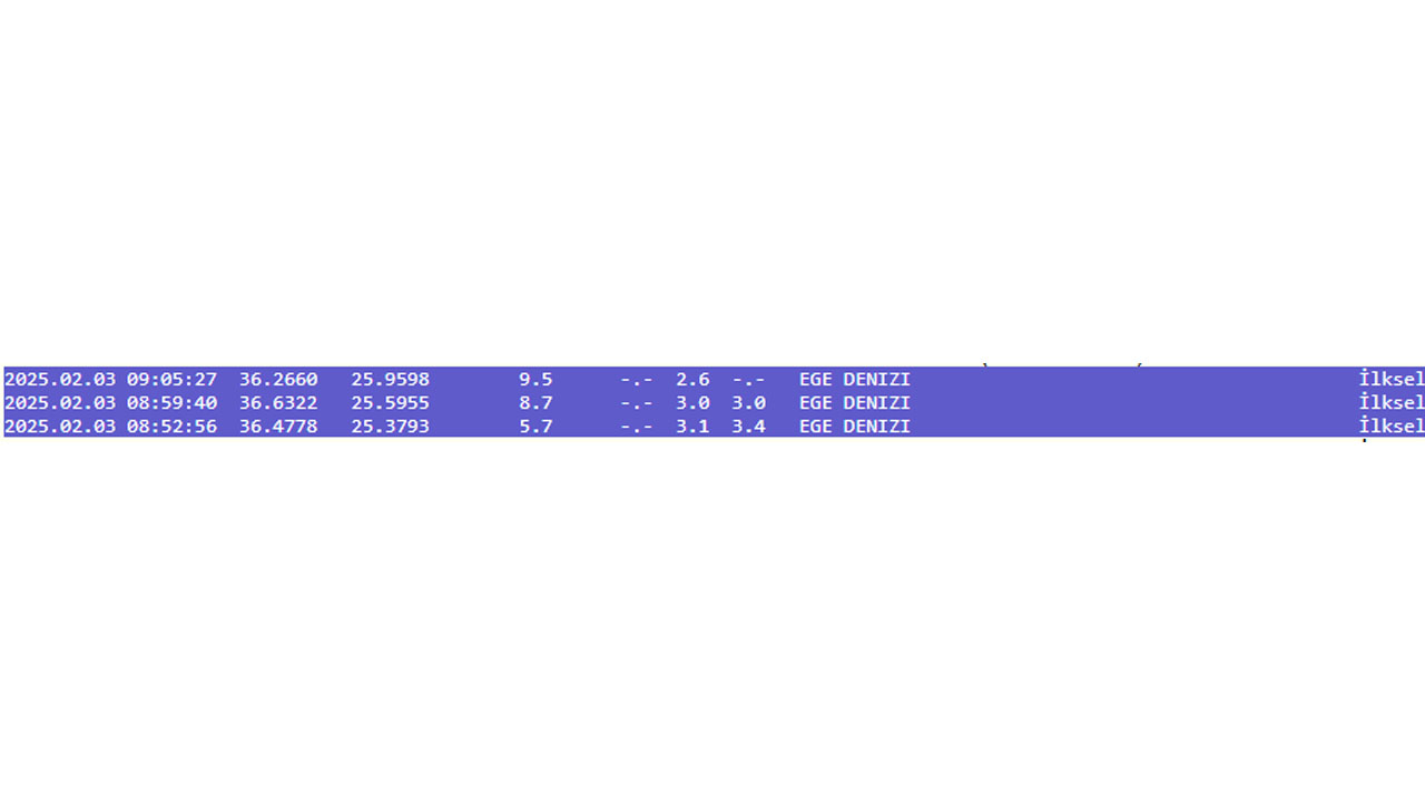 Ege Denizi'nde peş peşe meydana gelen depremler paniğe neden oldu. Ege Denizi'nde 2 Şubat Pazar günü (dün) saat 13.00 ile 3 Şubat Pazartesi günü bugün saat 12.45 arasında meydana gelen depremleri derledik. İşte son 24 saatteki depremlerin büyüklüğü...