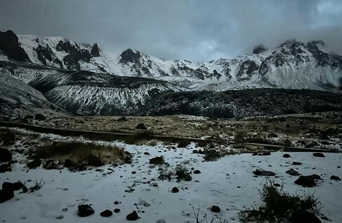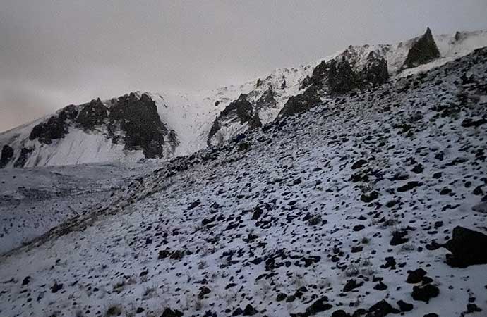 Erciyes Dağı'nda gece saatlerinde başlayan yağmur, 3 bin 916 metredeki zirveden 3 bin 500 metredeki Hörgüçkaya ve Şeytanderesi mevkisine kadar kara dönüştü.